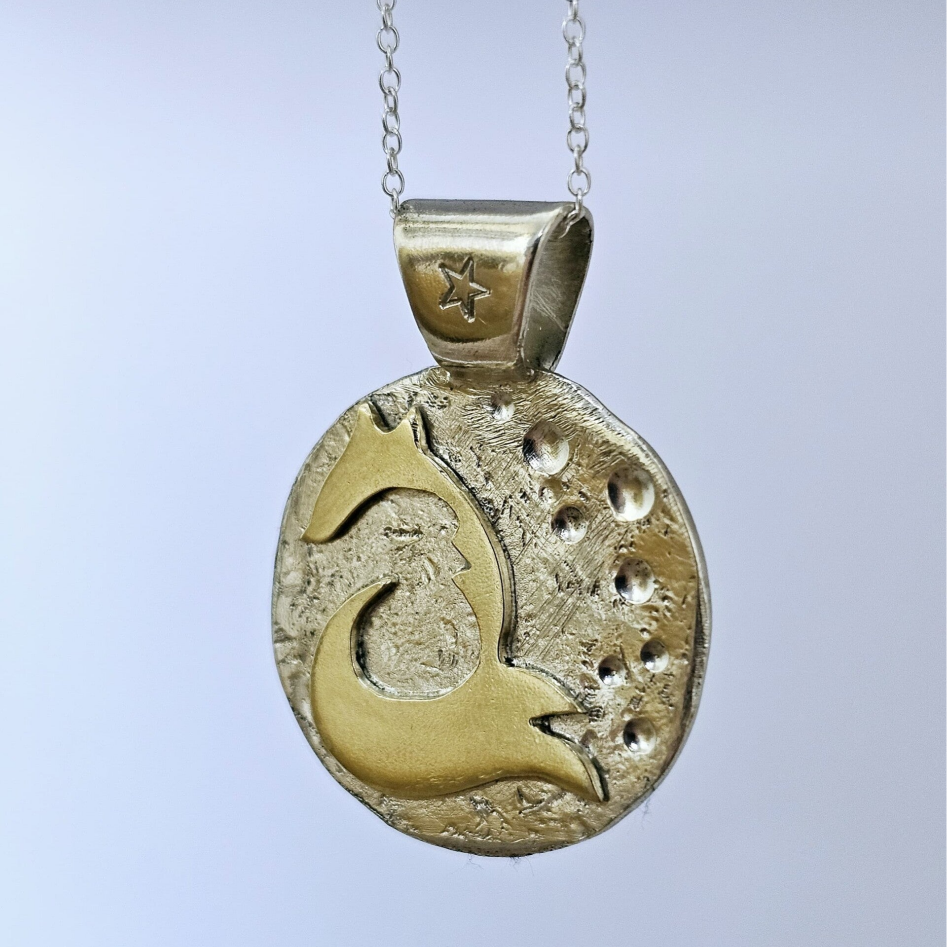 A textured Sterling Silver moon provides the backdrop to a brassy fox bathing in the moonlight overseen by a star stamped bail.
